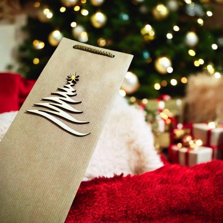 Hnedá taška na víno – papierová. Vrámci našej ponuky si môžete tašku vybrať ako čistú alebo s vianočným motívom vyrezávaným z dreva. Taška a viazanie je z kvalitného a elegantne pôsobiaceho materiálu.